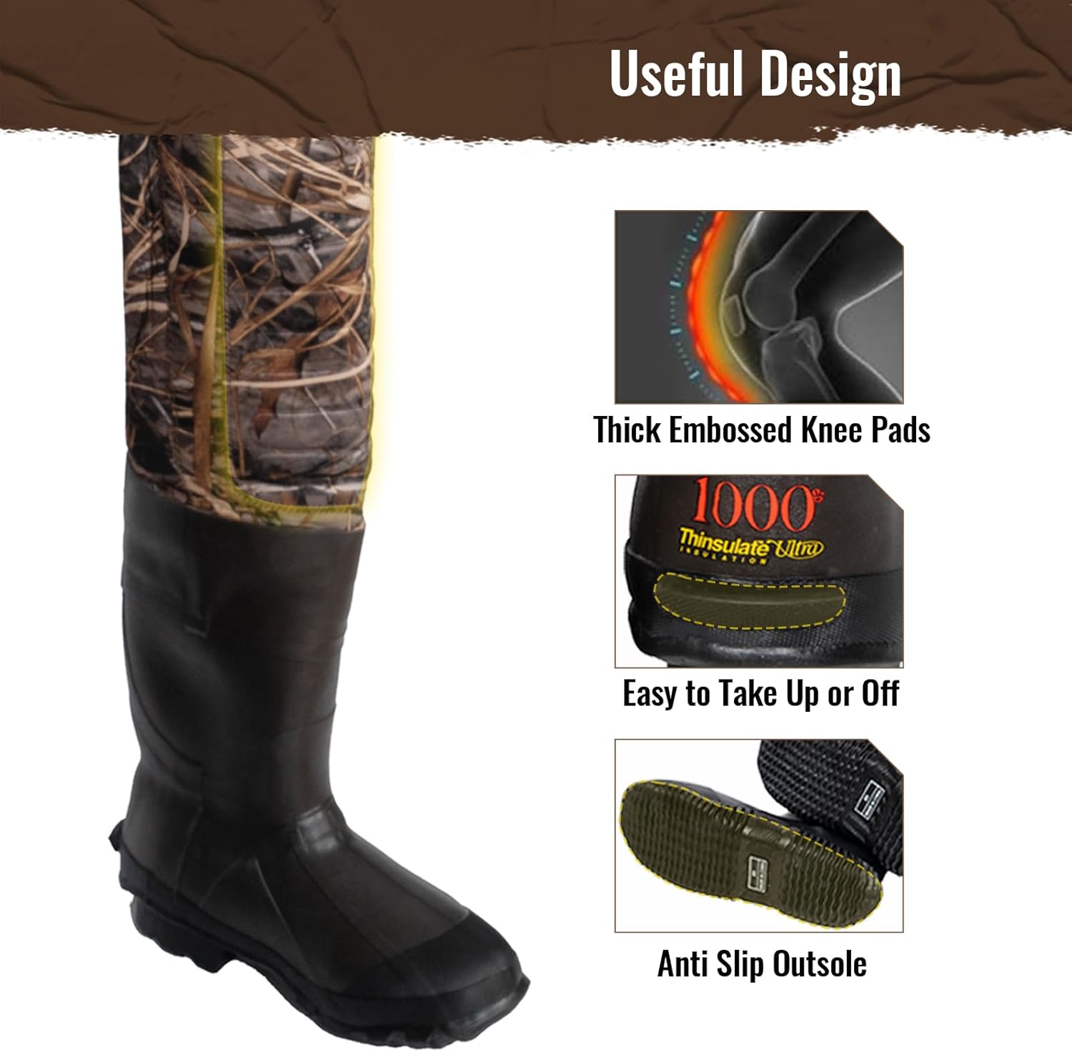 Crafted with high-quality neoprene material, these waterproof waders offer superior flexibility and insulation to keep you warm and dry in any weather conditions. The 1000G Thinsulate insulated rubber boots provide exceptional warmth without adding extra bulk, ensuring your feet stay comfortable during long hours of hunting or fishing.